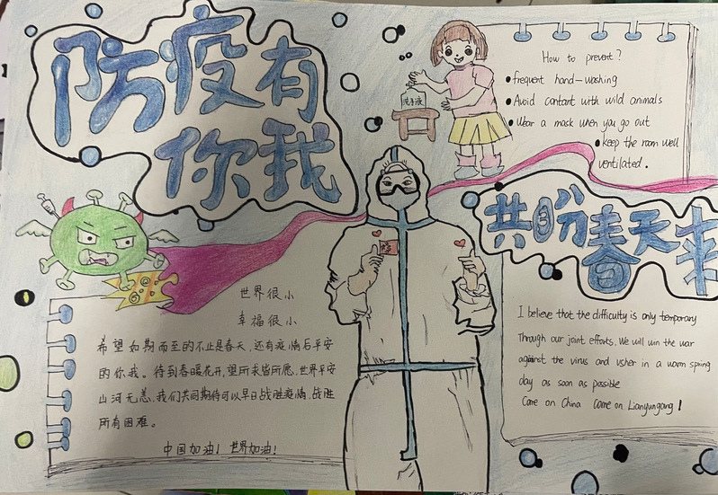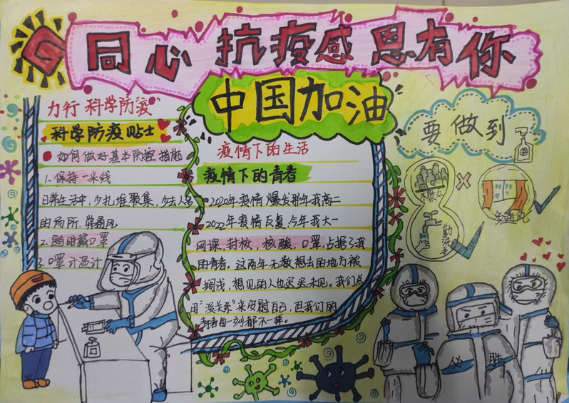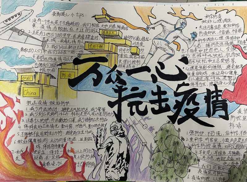 此次活动的开展,不仅展示了当代老员工的疫情防控知识,还调动了同学们抗击疫情的积极性,更增强了同学们的社会参与感和责任感。小小手抄报,传递出疫情防控的正能量,汇聚成坚决打赢抗疫攻坚战的强大力量,推动了积极防控疫情的工作热情!