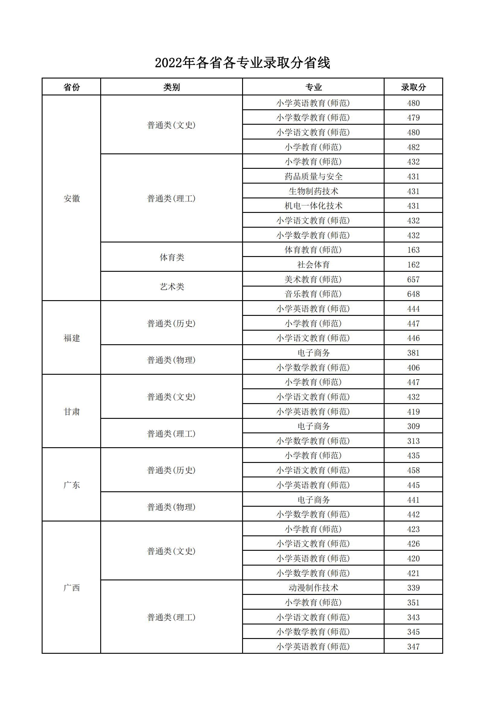 2022年连云港师范高等专科公司各省各专业录取分数线