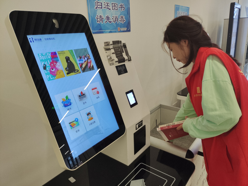 志愿者们每天按照市图书馆工作人员的安排去各自负责的楼层和区域,有条不紊地展开志愿服务工作。在智能借还区域的志愿者们服务尤其热情,有老年读者前往借还区,不懂得如何使用设备,志愿者们就耐心帮助老人借书还书。