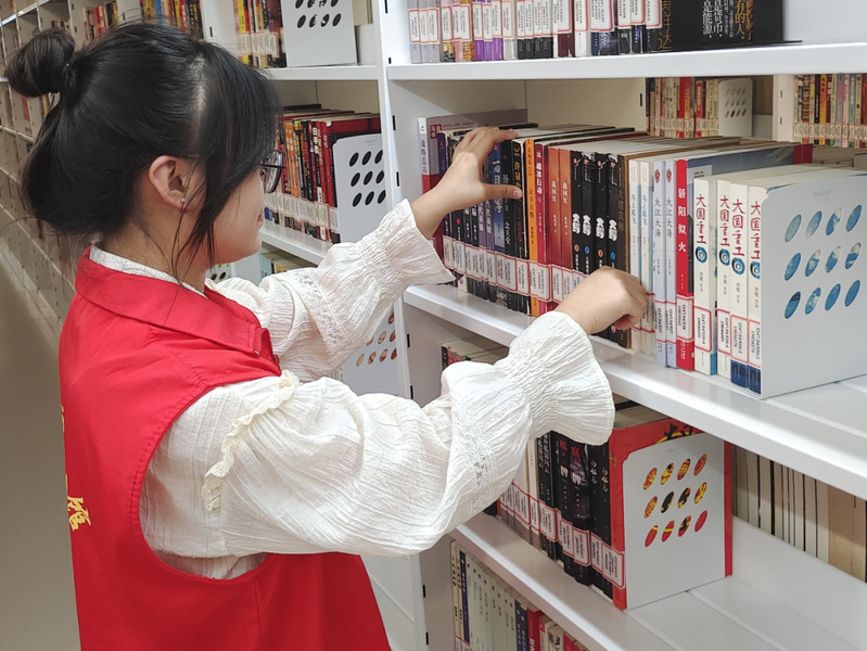 四楼的文学区更显安静,大多是成年人在此备战考试,志愿者们接到了整理书架的任务,仔细地校对,将一本本书籍归位,当整理到自习区旁边的书架时,为了不影响在复习的读者,志愿者们放慢了速度,轻手轻脚地整理书籍。热心、细心、耐心、贴心是我们志愿者的服务宗旨。