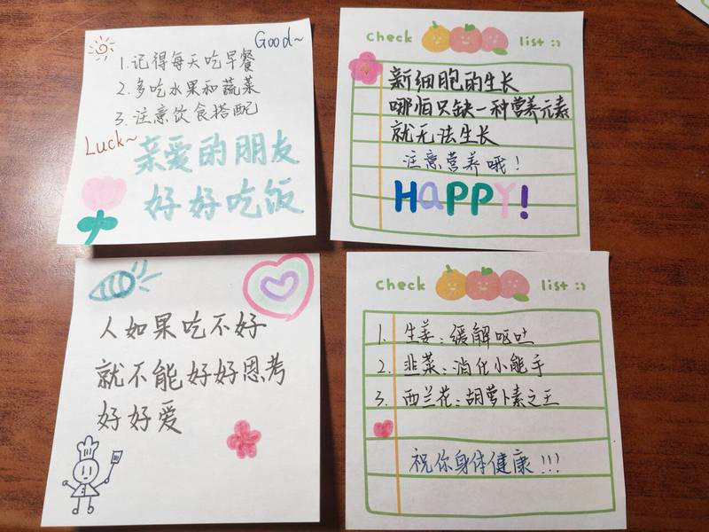 活动,如火如荼,教室里充满了欢声笑语和活跃的气氛,社团成员们忙得不亦乐乎,大家手持便利贴和彩笔,认真地书写着营养寄语,每一笔、每一划都凝聚着他们对健康饮食的热爱和关注;室外活动现场,有的则穿梭在人群中,将写好的寄语便利贴送给路过的员工,让更多的人能够看到并感受到营养知识的重要性。有的驻足观看,并积极参与其中。有的同学在仔细阅读便利贴上的营养寄语后,点头称赞,表示这些寄语既实用又贴心;有的同学则主动向社团成员请教营养方面的问题,得到了耐心的解答和专业的建议。