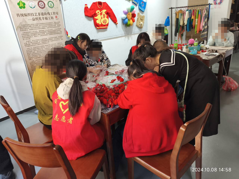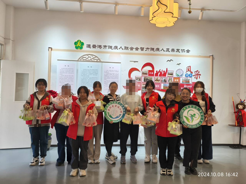 馨康宝贝融合园位于海州区海宁西路,是一家特殊儿童教育的示范性机构,致力于“唐氏综合征”等患儿的康复、就业和日间照料一体化工作。在开展志愿服务之前,园长带领志愿者们参观了机构环境,对机构和患儿的情况进行了介绍。接着志愿者们陪伴“糖宝”们一起制作手工柿子,在制作过程中,志愿者摆放好制作小柿子的材料,耐心地讲解,引导着每位“糖宝”一步步地完成制作,在不断重复的练习和挑战中,“糖宝”们的动手能力得到了锻炼,每当完成一个作品,他们会很自豪地向志愿者们展示并分享。