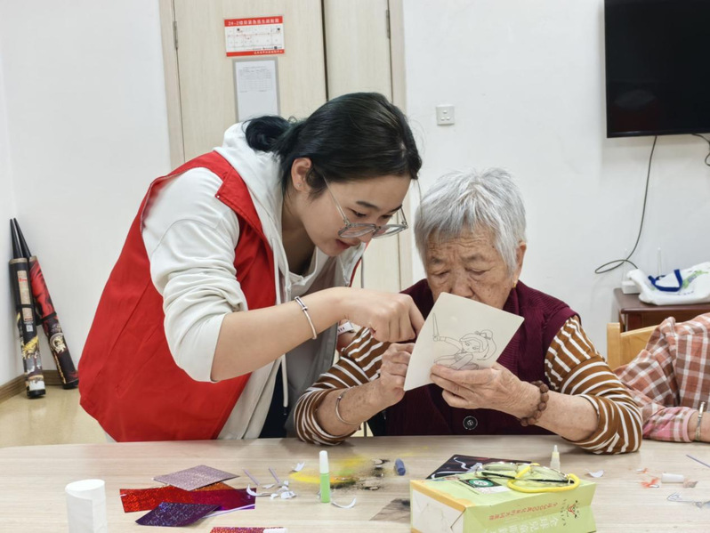 为让活动兼具专业性与体验感,志愿者团队做好充分准备,精心采购并整理了彩沙、沙画台、专用底板等工具,还针对沙画创作流程与互动技巧进行了提前演练,力求为老人们带来专业且贴心的服务体验。在活动室里,老人们端坐等候,眼神中满是对沙画创作的期待;志愿者们按照分工,以“一对一”的模式主动走到每位老人身边,耐心开启沙画创作指导。“奶奶,撒沙的时候手要稳,先铺好底色再勾勒轮廓,这样画面会更整齐。”
