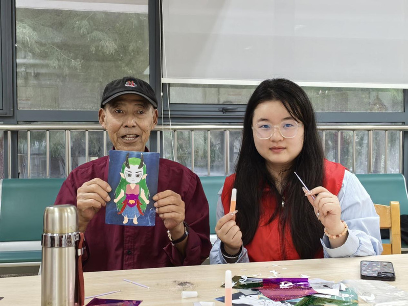 创作过程中,志愿者们还鼓励老人们打破模板局限、发挥想象——有位爷爷在创作哪吒电影中敖丙的形象时,没有局限于传统的蓝色主基调,而是大胆选用多色搭配,最终呈现出独一无二的个性化沙画作品。当细腻的彩沙在老人与志愿者的指尖缓缓流淌,逐渐勾勒出鲜活的图案时,活动室里的时光仿佛变得格外舒缓;老人们的赞叹声与志愿者的笑声交织在一起,温暖氛围弥漫全场。