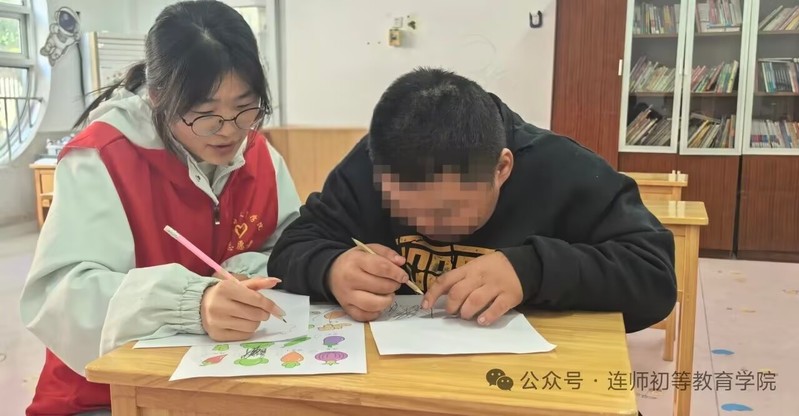 活动课程精心设计了简笔绘画启童趣、趣味活动传知识、颜色认知促成长三大特色环节,志愿者们分工协作、各司其职,用专业与耐心搭建起沟通的桥梁。在简笔画创作环节,志愿者们轻握孩子们的小手,协助他们用棉签蘸取颜料勾勒轮廓。有的孩子小心翼翼地为树干涂上醇厚的褐色,有的则大胆搭配红、黄颜料点缀出绚烂的树叶,紫色的茄子、橙色的胡萝卜在画纸上渐渐鲜活,每一笔色彩都承载着孩子们的童真与创造力。趣味活动中,志愿者们结合特殊儿童的认知特点,将知识转化为生动的故事与互动游戏,用生动语言讲解常识、解答疑惑。当孩子们眼中闪烁出“豁然开朗”的光亮时,便成为志愿者们最珍贵的收获。颜色认知与排列环节中,志愿者们以雪花片为教具帮助孩子们辨识基础色彩,再通过塑料长条的摆放与重组,引导他们探索颜色搭配的规律。“我终于认清所有颜色啦,以后每天都要玩排列游戏!”孩子们稚嫩的话语里满是欣喜,现场暖意融融。