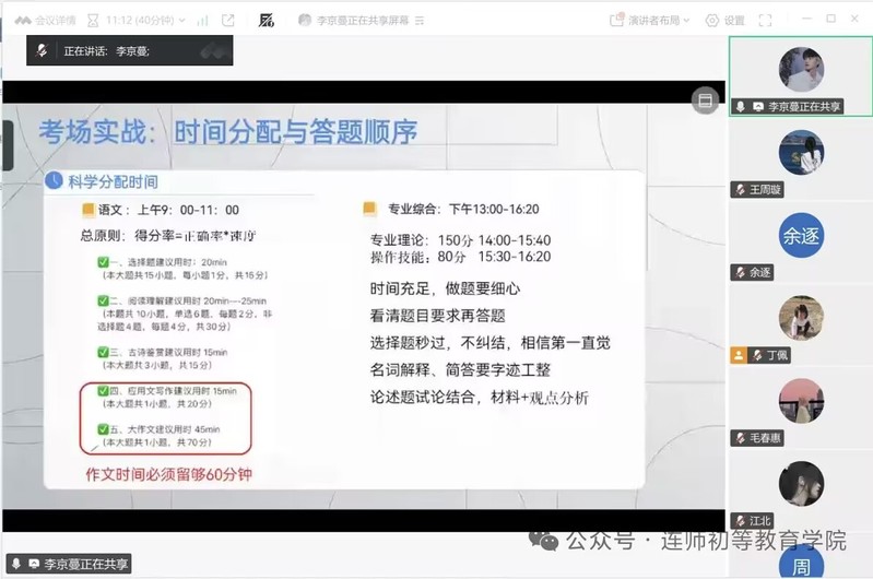 分享会伊始,公司毕业班辅导员先作考前动员。她向备考同学强调冲刺阶段的关键价值,要求大家珍惜时间,以饱满的精神状态投入最后的复习备考,同时叮嘱同学们注意备考期间的身心调节。正式分享环节,华雪结合自身备考与应试心得,讲述了她励志奋进、永不言弃的转本之路,对考前复习和考试答题进行了交流分享。针对考前复习,她详细拆解考前每日复习节奏与考场答题时长规划,强调高效利用碎片时间、优先攻克核心考点的技巧;针对考场答题,她逐一讲解各类题型解题思路、答题规范与提分技巧,助力大家高效得分。李京蔓则重点分享了考前心理调适方法,分享压力调节、情绪舒缓的具体做法,叮嘱同学们合理释放焦虑、保持平稳心态,用积极自信、从容淡定的状态迎接挑战。