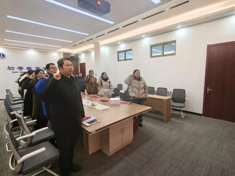 随后,全体党员教师面向鲜红党旗,在党支部书记领誓下庄严举起右拳,重温入党誓词。“我志愿加入中国共产党……”铿锵誓言回荡在活动现场,既是对入党初心的回溯,也是对育人使命的重申,让每位党员教师接受了深刻的精神洗礼与党性锤炼。